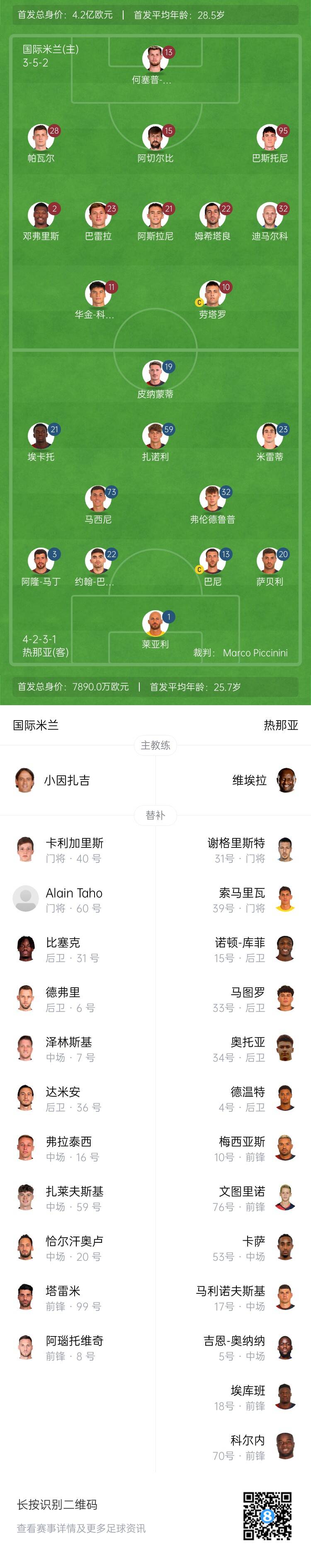 2月23日訊 意甲第26輪,國米主場對陣熱那亞。賽前,官方公布了本場的首發(fā)名單。