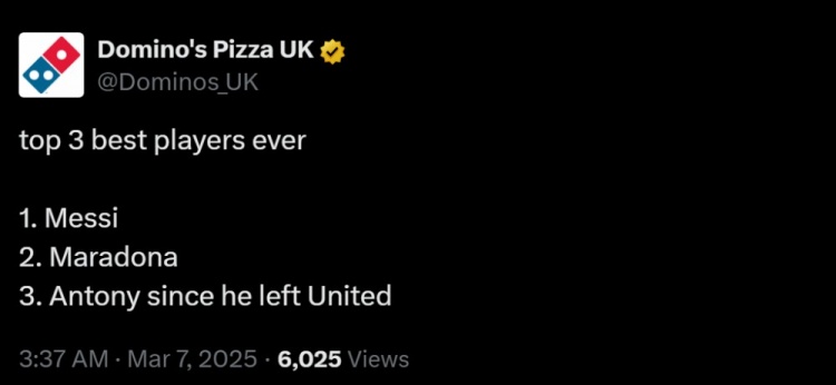達(dá)美樂(lè)披薩吹圓神:歷史前三是梅西、馬拉多納、離開(kāi)曼聯(lián)的安東尼