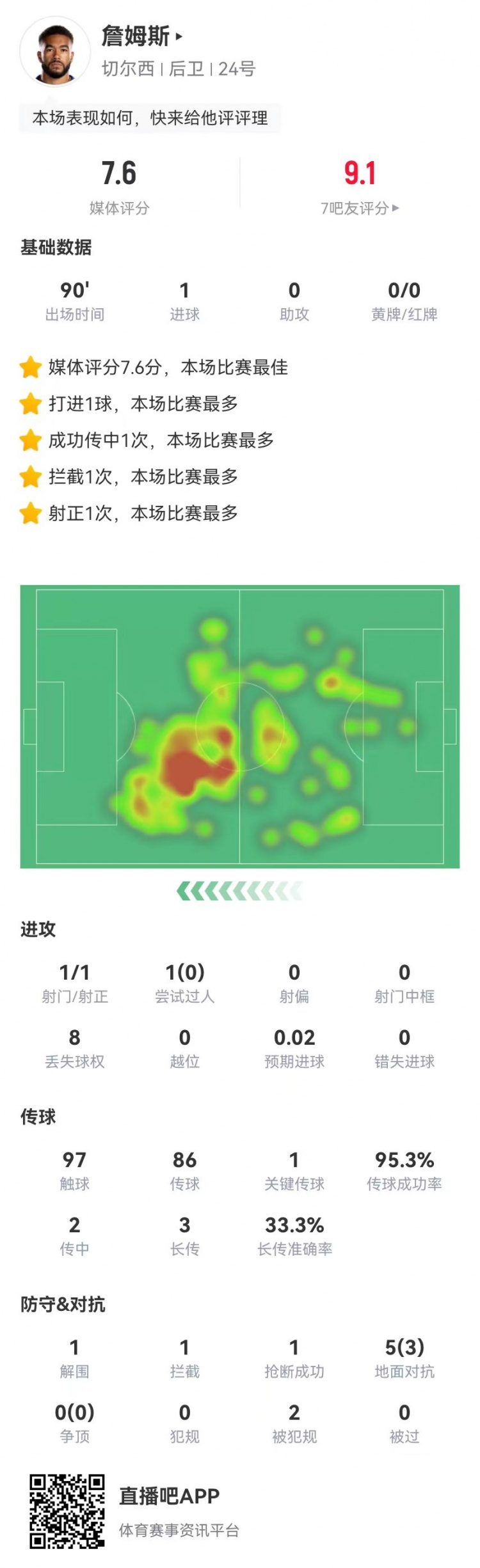 里斯-詹姆斯客串后腰數(shù)據(jù):1球+1關鍵傳球 5對抗3成功 7.6分最高