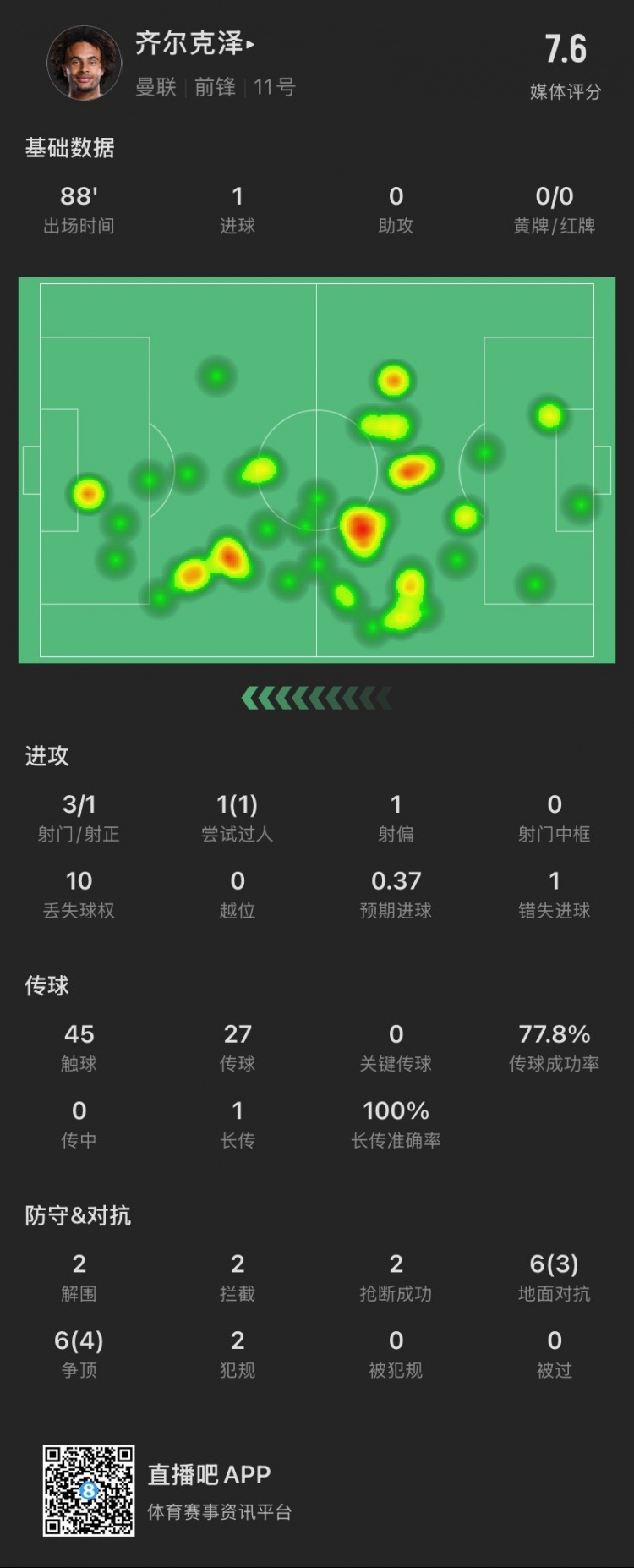 3月7日訊 歐聯(lián)杯1/8決賽首回合,曼聯(lián)客戰(zhàn)皇家社會的比賽正在進行。第88分鐘,齊爾克澤被換下場。此役,他打進一球,獲評7.6分。