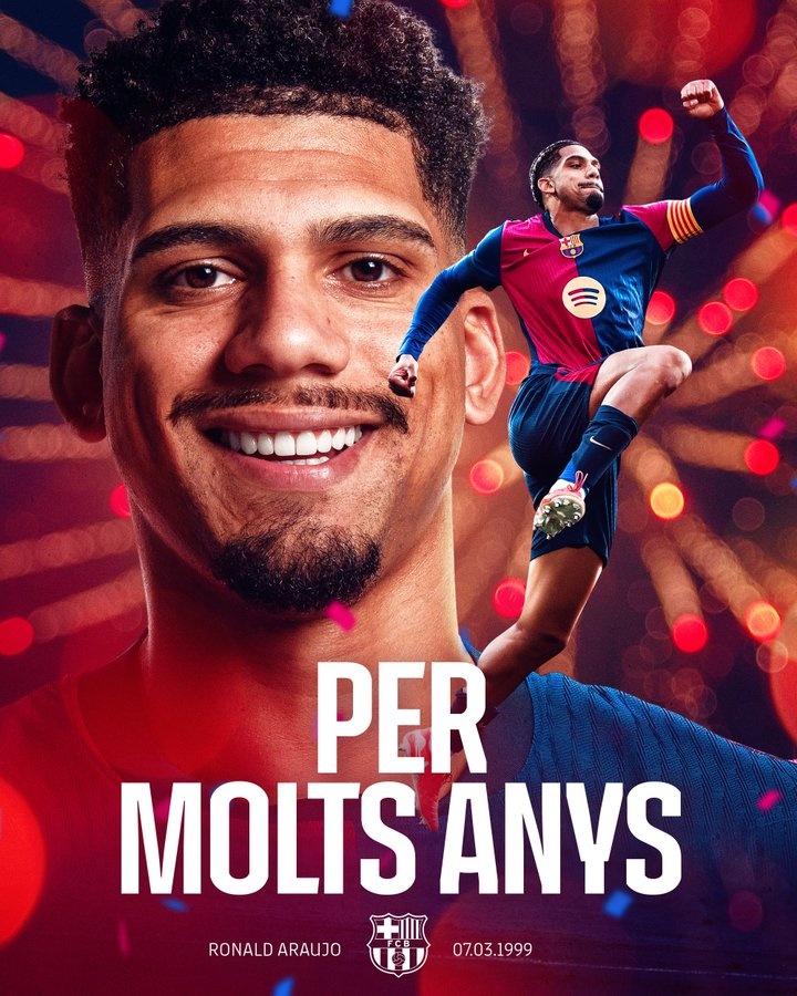 3月7日訊 今天是巴薩后衛(wèi)羅納德-阿勞霍的26歲生日,俱樂(lè)部官推發(fā)文為他送上祝福。