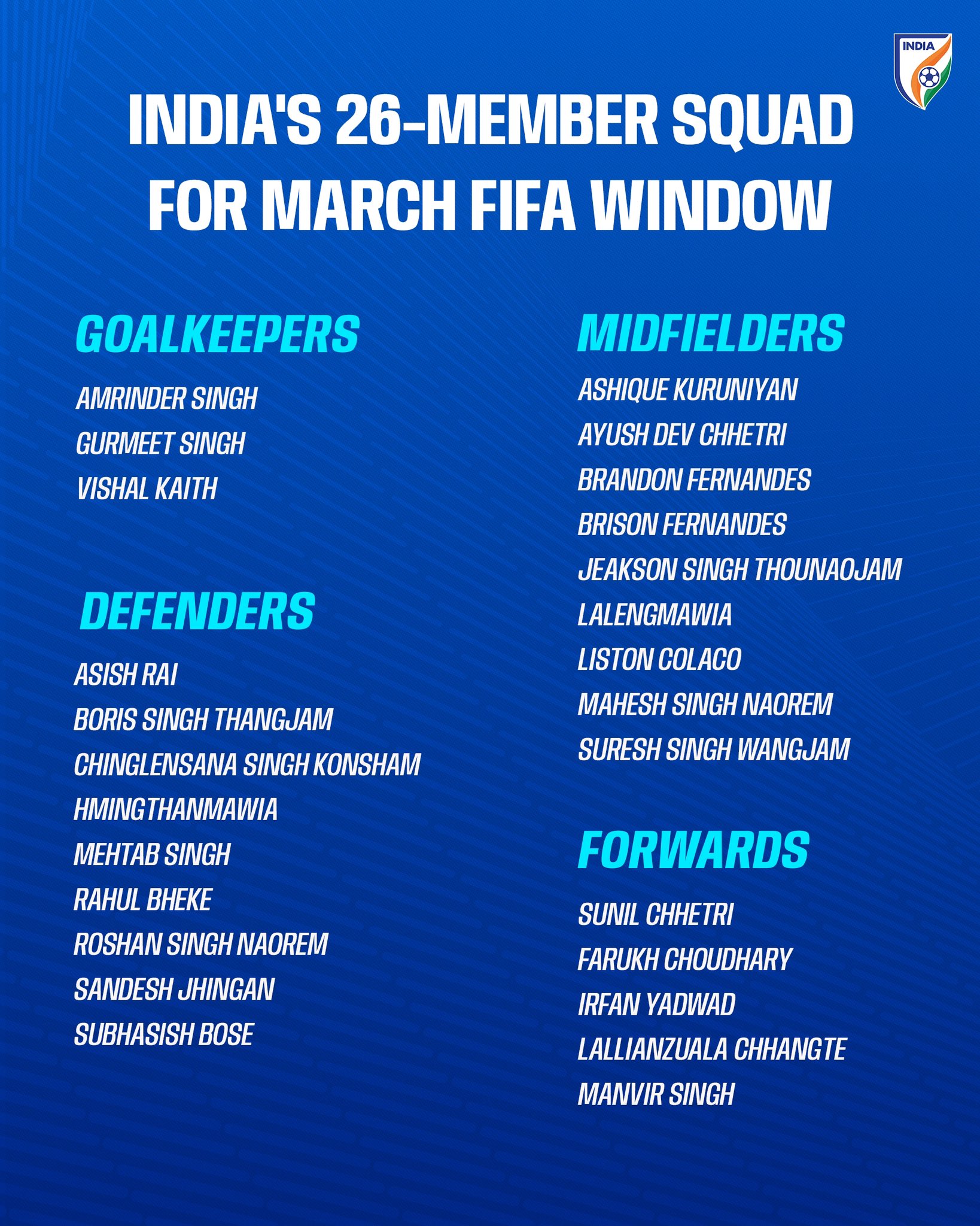 印度將在3月19日友誼賽對(duì)陣馬爾代夫,3月25日亞足聯(lián)亞洲杯預(yù)選賽對(duì)陣孟加拉國。