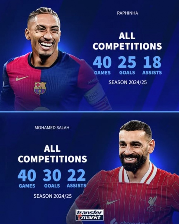 金球獎兩大熱門?拉菲尼亞40場25球18助攻,薩拉赫40場30球22助攻