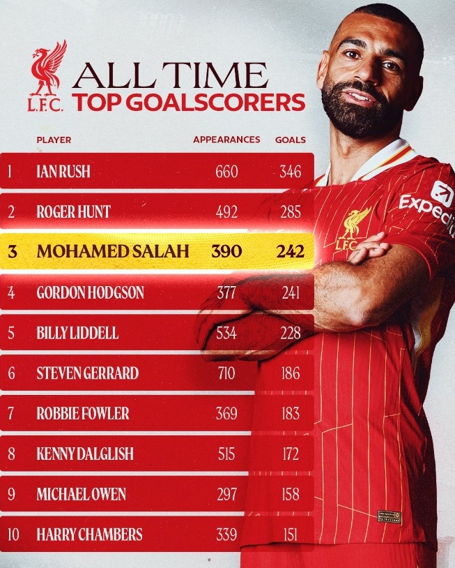 本場比賽取得進球后,薩拉赫已經(jīng)為利物浦打進242球,躋身紅軍隊史射手榜第三位。