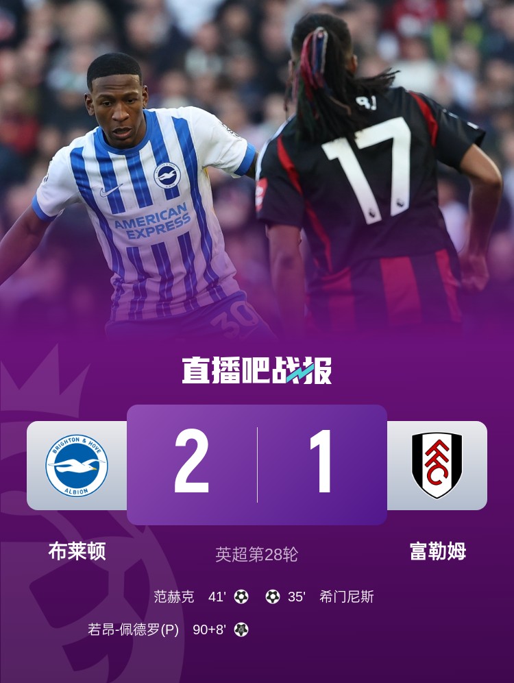 英超第28輪,布萊頓2-1逆轉(zhuǎn)富勒姆。上半場,希門尼斯首開記錄,伊沃比助攻,范赫克冒頂后將功補過扳平;下半場,三笘薰進球越位,佩德羅讀秒造點+點射絕殺。