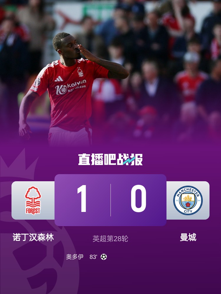 遭絕殺! 曼城0-1森林先賽仍第4 森林終結(jié)對曼城三連敗奧多伊制勝
