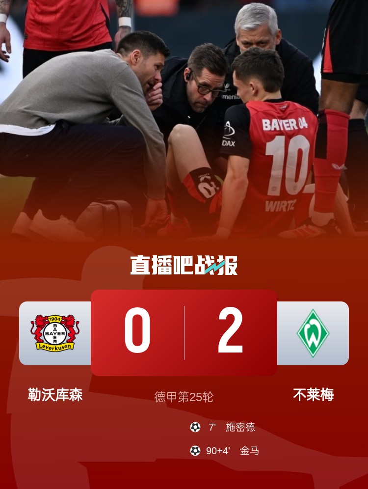 德甲第25輪,勒沃庫森0-2不敵不萊梅,結(jié)束23輪不敗。上半場,斯塔格助攻施密德破門,維利科維奇進球被吹越位,阿萊克斯-加西亞任意球中框;下半場,替補登場的維爾茨傷退,伯克打入一球被吹越位,金馬鎖定勝局。